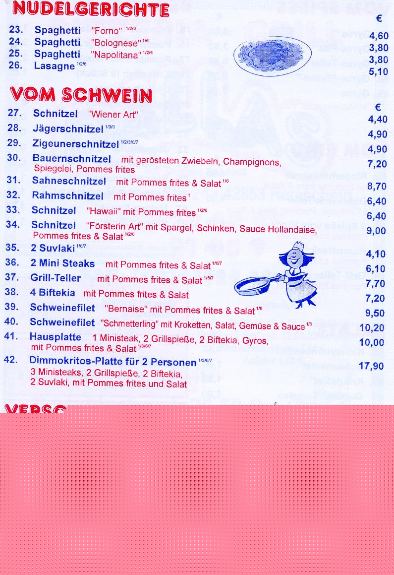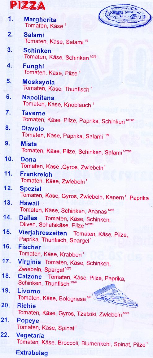 Pizza, Nudelgerichte, Schnitzel,Pizza, Grillteller, Bratwurst,reibekuchen, Hähnchen,Steaks,vom Schwein und Rind, Gyros, Pommes, Schaschlik, Djuwetsch Reis, Salate, Suppen und gepflegte Getränke.