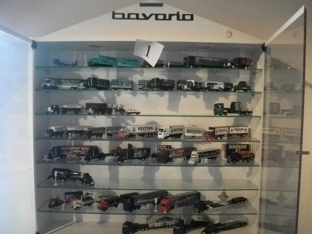 Hier handelt sich um die Vitrine NR. 1 diese hat eine Tiefe von 18 cm, Breite 84 cm, Höhe 71 cm, mit 7 Einlegeböden aus Glas und zwei Glastüren, im Inneren befinden sich 20 LKW's 15 Anhänger und 13 Sattelschlepper mit Auflieger.
